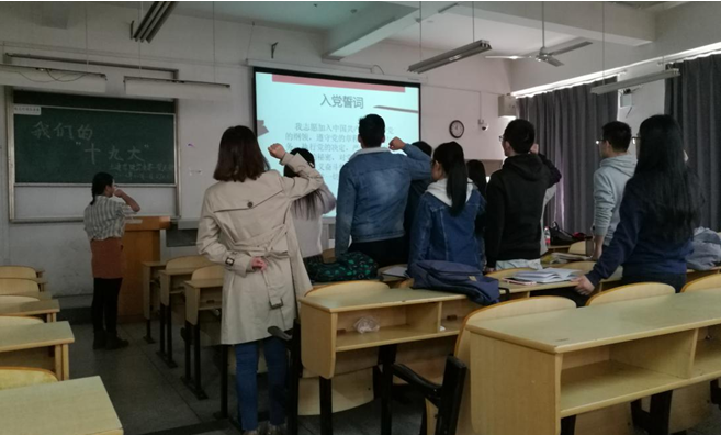 2017年11月1日,土建学院学生第一党支部在科教315开展了“”主题活动,并邀请到沈晓娜老师参与此次活动,一起学习交流十九大精神。活动开始主持人致开场词,接着在主持人的带领下,全体成员起立宣读入党誓词。