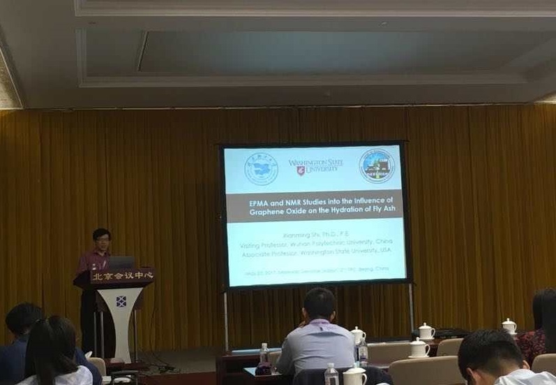 大会特邀武汉轻工大学土木工程学科“常青学者”特聘教授石鲜明教授,以武汉轻工大学为参加单位,作题为“氧化石墨烯用于粉煤灰混凝土水化的核磁共振研究”的主旨发言(Keynote Talk)。该报告重点阐述了石教授团队在利用一种新型纳米材料(氧化石墨烯)对室温免强碱激活粉煤灰水化反应催化机理的研究及该技术在透水混凝土中的应用,展示了该团队在废料资源化上的最新科研成果。